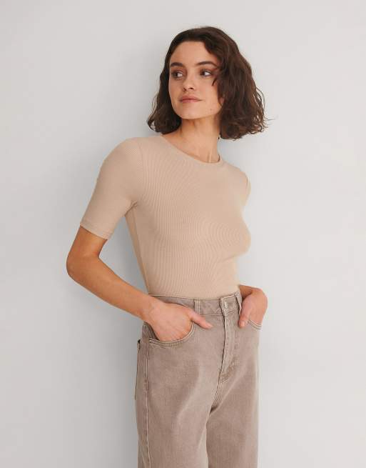 NA-KD – Prążkowany beżowy T-shirt o obcisłym kroju z okrągłym dekoltem