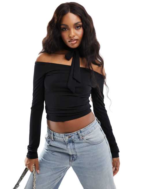 NA-KD x Chloe Monchamp – Czarny top z długimi rękawami i zdobieniem przy szyi