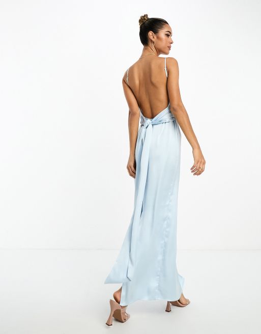 NA-KD x Chloe Schuterman – Pudrowoniebieska satynowa sukienka maxi z odkrytymi plecami i wiązaniem z tyłu