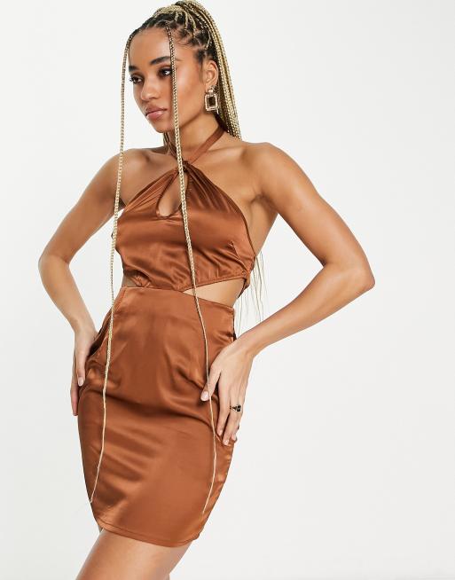 NaaNaa – Brązowa satynowa sukienka mini typu bodycon z wycięciami