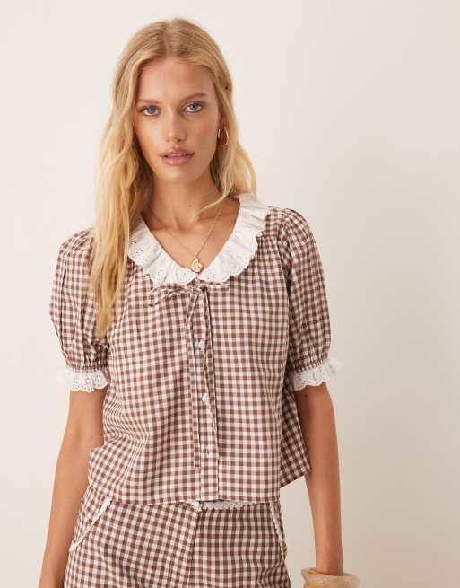 Neon Rose – Bluzka w brązową kratkę vichy z haftowanym kołnierzykiem, część zestawu