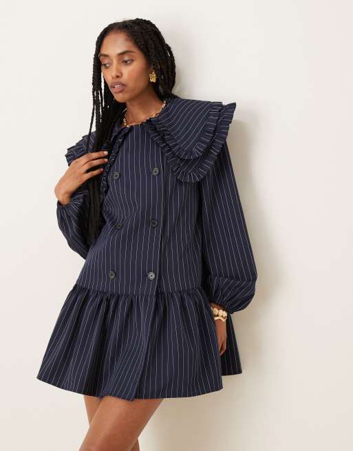 Neon Rose – Granatowa luźna sukienka mini z podwójnym kołnierzem w prążki