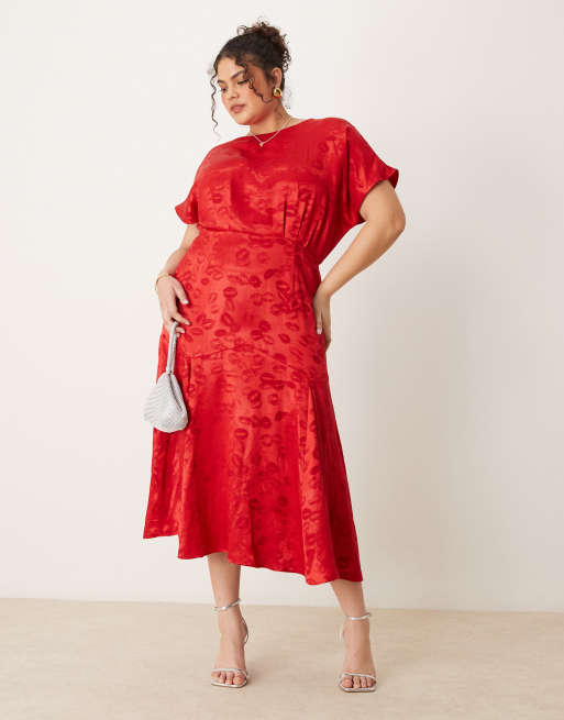 Never Fully Dressed Plus – Czerwona satynowa sukienka midaxi w wytłoczony wzór