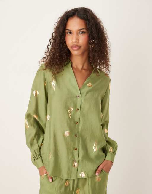 Never Fully Dressed – Koszula w kolorze khaki z foliowanym wzorem w muszle, część zestawu