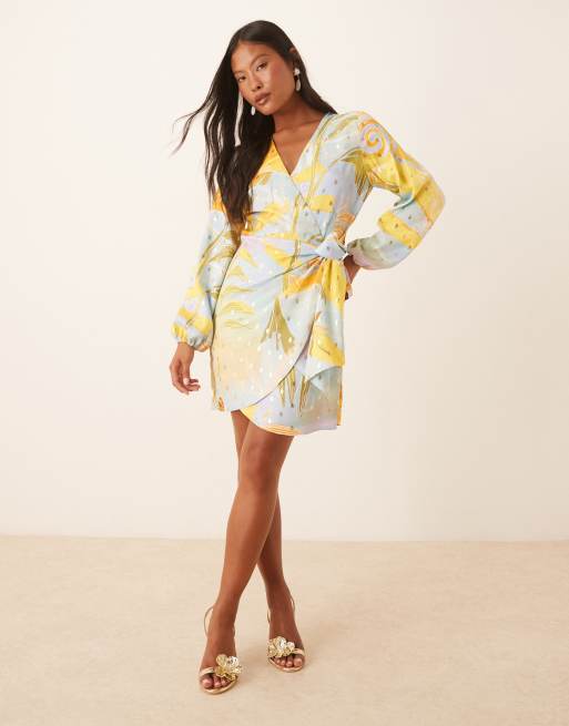 Never Fully Dressed Petite – Metaliczna sukienka mini z balonowymi rękawami we wzór z motywem słońca