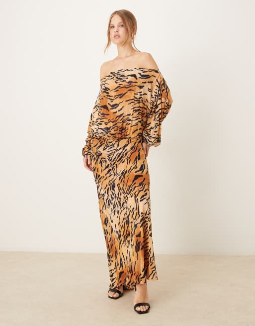 Never Fully Dressed – Plisowana sukienka maxi z odsłoniętymi ramionami w tygrysi wzór