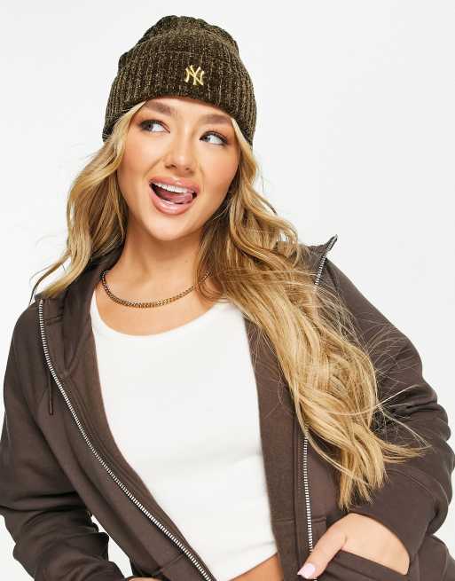 New Era Exclusive – Brązowa szenilowa czapka beanie w stylu rybackim ze złotym logo NY