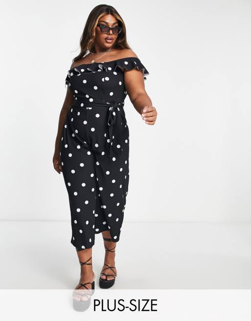 New Look Curve – Czarny kombinezon z dekoltem bardot z falbanką we wzór w groszki