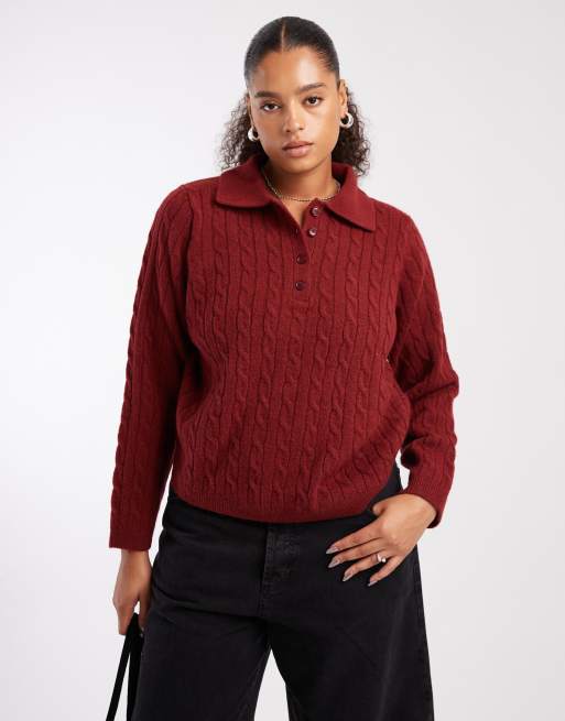 New Look Curve – Czerwony sweter z kołnierzykiem polo z dzianiny o warkoczowym splocie