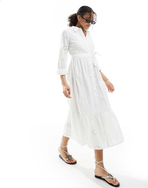 New Look – Biała sukienka koszulowa midi z haftem angielskim