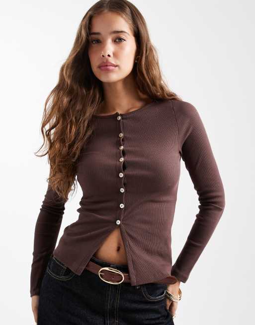 New Look – Brązowy zapinany na guziki top z długimi rękawami