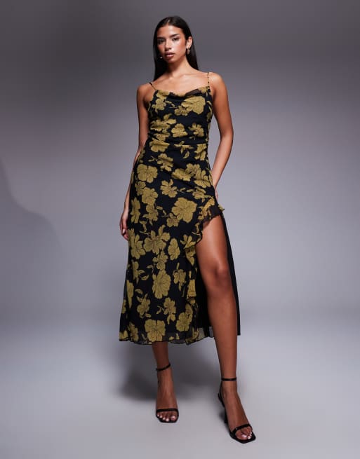 New Look – Czarna sukienka midi z drapowanym dekoltem w kwiatowy wzór