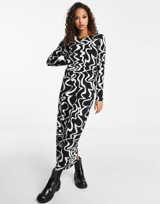 New Look – Czarna sukienka midi z długim rękawem i ze wzorem