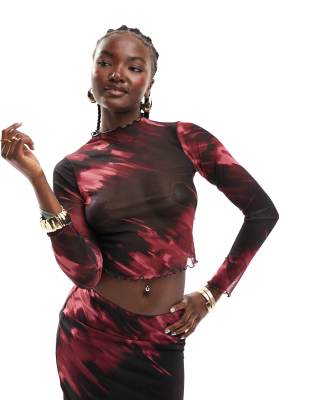 New Look – Czerwony siateczkowy top z długimi rękawami we wzór