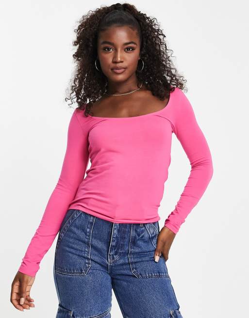 New Look – Jaskraworóżowy top z dekoltem w kształcie litery U i długim rękawem