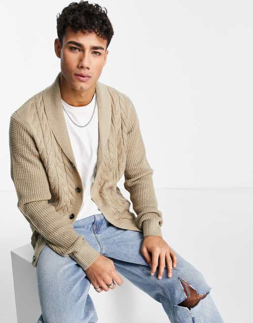 New Look – Kamiennobeżowy kardigan o warkoczowym splocie z kołnierzem szalowym