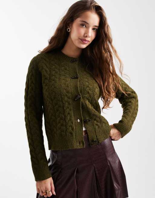 New Look – Kardigan o splocie warkoczowym w kolorze khaki z guzikami-kołkami
