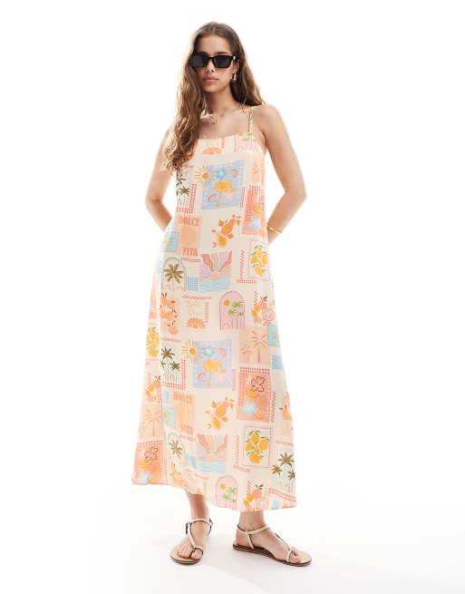 New Look – Kremowa prosta sukienka midi ze wzorem z włoskimi motywami