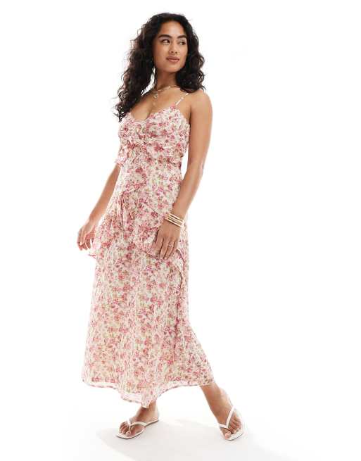 New Look – Kremowa sukienka midi z falbanką w kwiatowy wzór