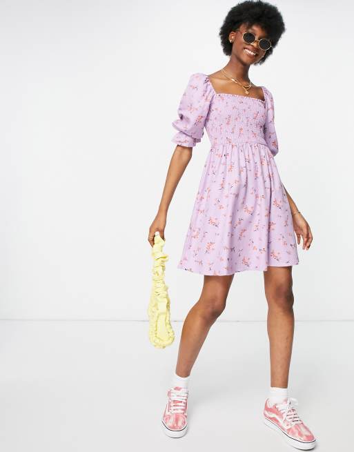 New Look – Liliowa marszczona sukienka mini w kwiaty