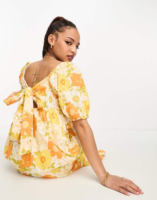 New Look – Pomarańczowa warstwowa sukienka midi z kwadratowym dekoltem i wzorem retro