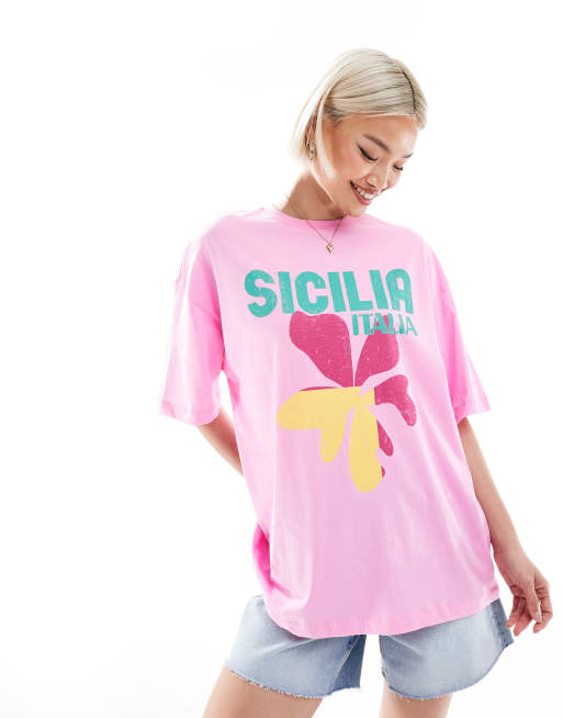 New Look – Różowy T-shirt oversize z logo i napisem Sicilia