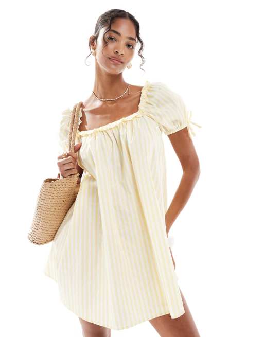 New Look – Żółta popelinowa sukienka mini w paski z kwadratowym dekoltem