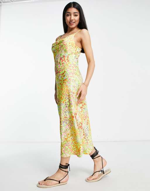 New Look – Żółta sukienka mini z drapowanym dekoltem w drobny kwiatowy wzór