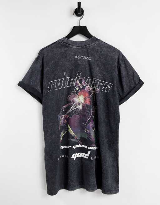 Night Addict – Czarny T-shirt z efektem sprania i nadrukiem Robot Wars na piersi