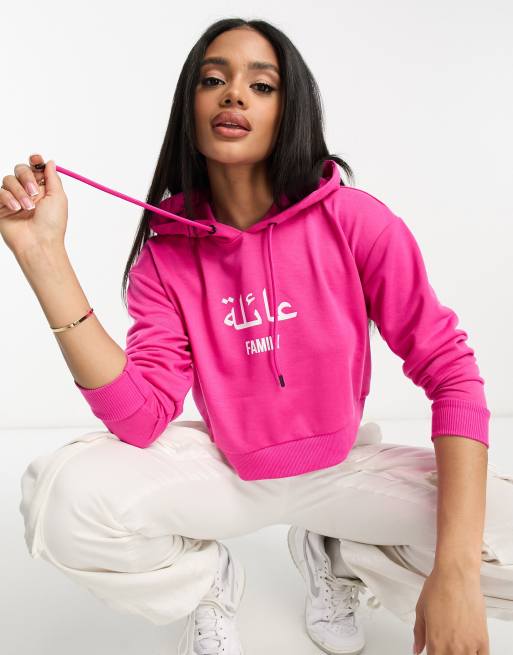 Night Addict – Jaskraworóżowa krótka bluza z kapturem i nadrukiem „Family“