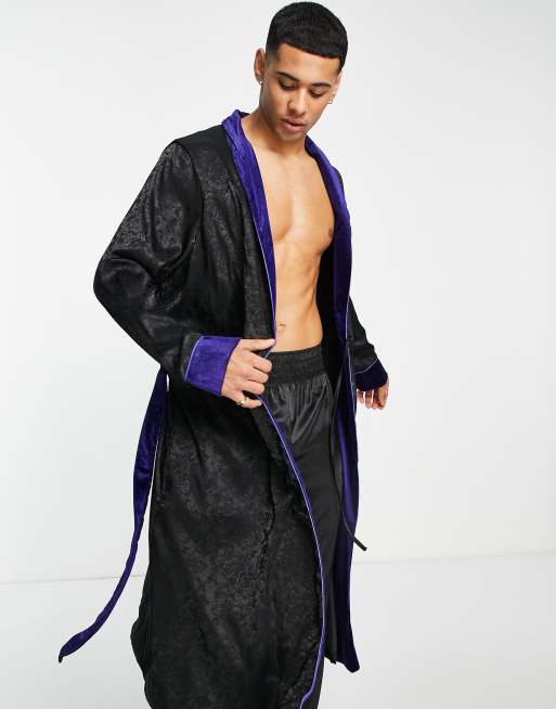 Night – Czarny aksamitny szlafrok z żakardowym wzorem i fioletowym wykończeniem
