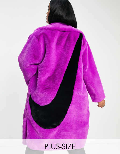 Nike Plus – Fioletowo-czarny długi płaszcz ze sztucznego futra z logo Swoosh