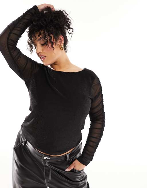 Noisy May Curve – Czarny brokatowy top z marszczonymi siateczkowymi rękawami