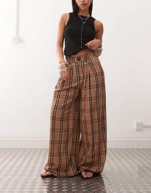 Noisy May – Brązowe spodnie z szerokimi nogawkami, zakładkami i wysokim stanem w kratkę