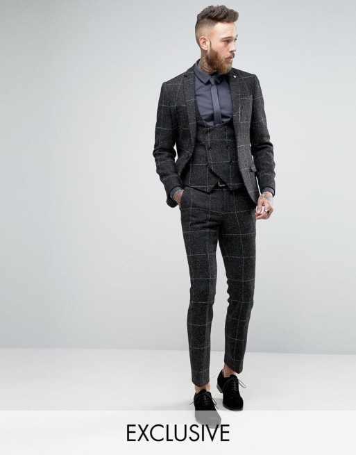 Noose & Monkey – Czarny obcisły smoking w kratkę z tweedu Harris