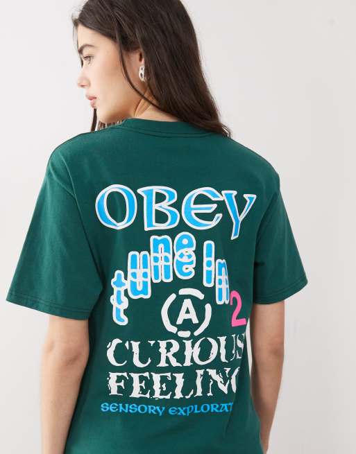 Obey – Ciemnozielony T-shirt z logo i grafiką Sensory na plecach