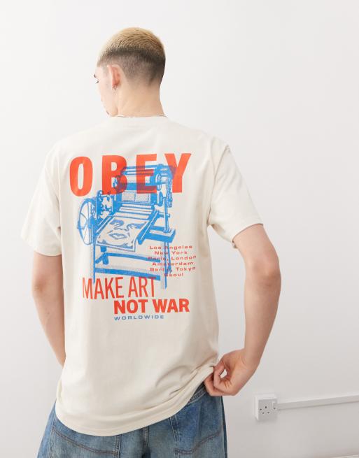Obey – Kremowy T-shirt z nadrukiem prasy drukarskiej i napisem „Make Art” na plecach