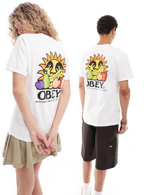 Obey Unisex – Biały T-shirt z grafiką z motywem owoców i słońca na plecach