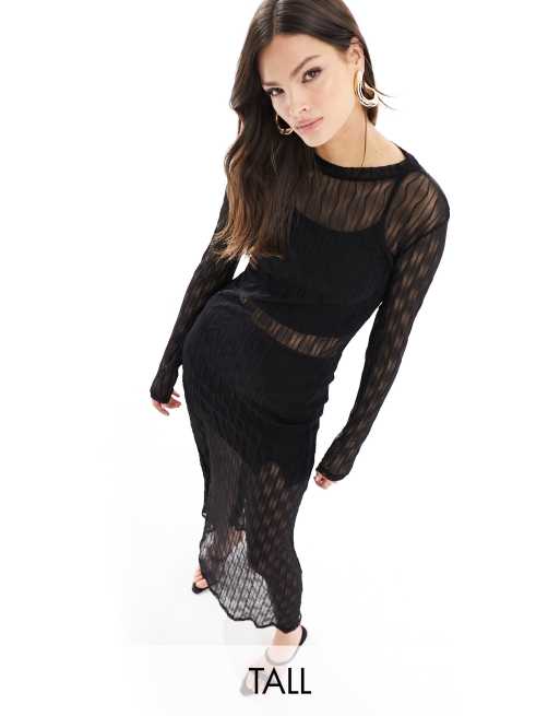 Object Tall – Czarna fakturowana sukienka maxi z długimi rękawami z prześwitującego materiału