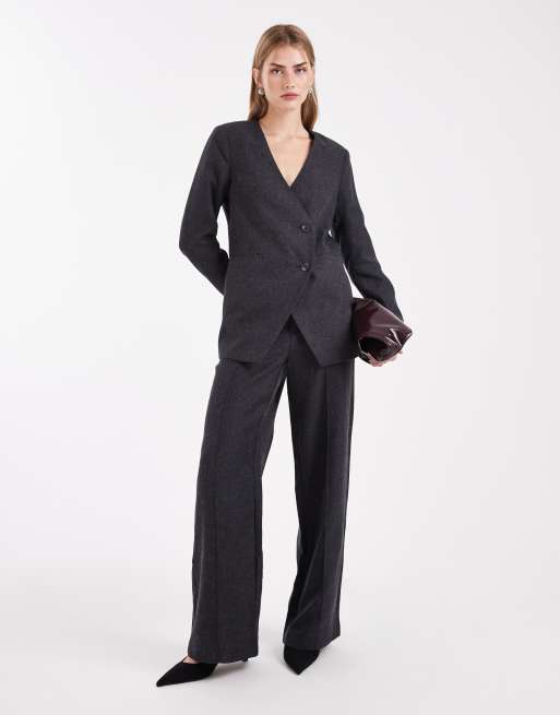Object – Ciemnoszary melanżowy zestaw w eleganckim stylu: spodnie z szerokimi nogawkami i marynarka z asymetryczną wstawką