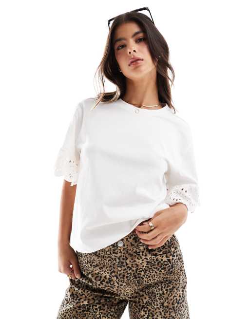 Object – Kremowy T-shirt o pudełkowym kroju z angielskim haftem na rękawach