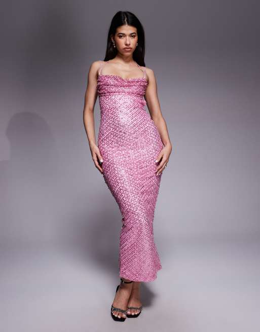 Oh Polly – Różowa sukienka maxi z dekoltem w kształcie serca z kryształkami