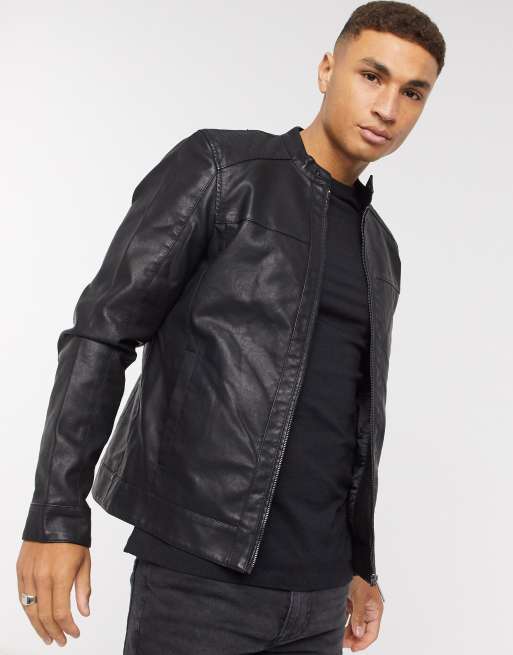 Only & Sons – Czarna kurtka z imitacji skóry z okrągłym dekoltem zapinanym na zatrzask