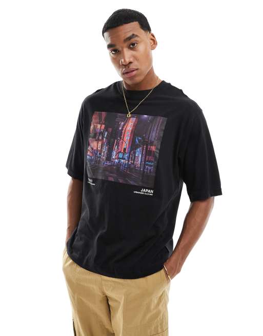 Only & Sons – Czarny T-shirt oversize z nadrukiem zdjęcia Tokyo