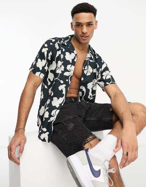 Only & Sons – Granatowa koszula z kołnierzykiem kubańskim w kwiatowy wzór