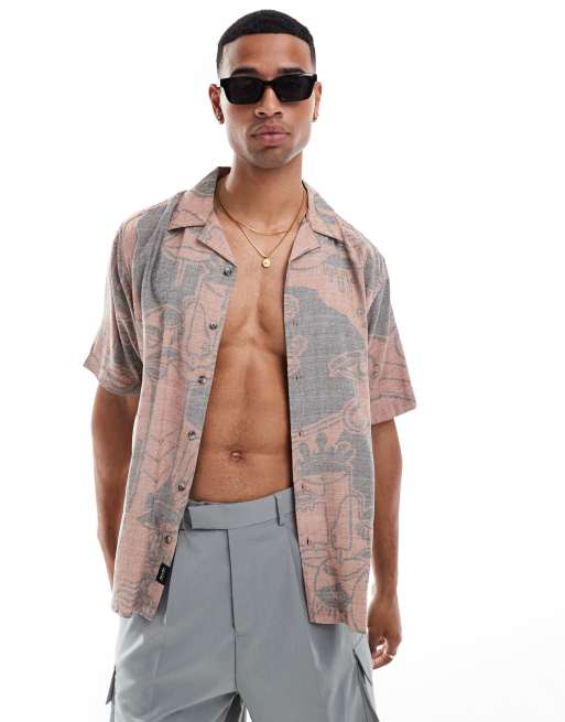 Only & Sons – Koszula z kołnierzykiem kubańskim i abstrakcyjnym wzorem na całości w spranym różowym kolorze