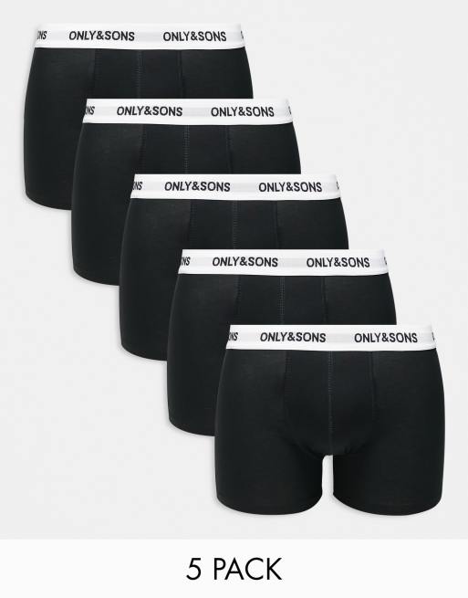 Only & Sons – Zestaw 5 par bokserek czarnych bokserek z białą taśmą z logo w talii