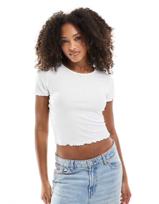 Only – Biały T-shirt o krótkim fasonie z karbowanym brzegiem