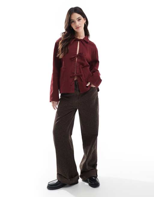 ONLY – Burgundowa kurtka jeansowa z wiązaniem z przodu