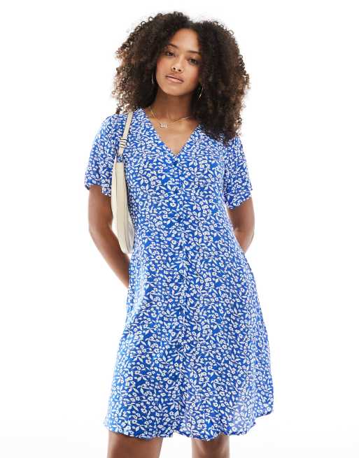 Only – Ciemnoniebieska wiązana w talii sukienka mini z dekoltem w szpic i kwiatowym wzorem